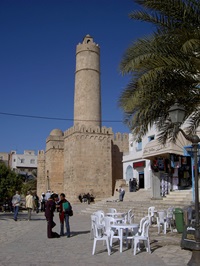 Gegenüber ist der Ribat (Sommer 8 - 19 Uhr, Winter 8.00 - 17.30 Uhr) vom Ende des 8. Jh. Wer nicht beide Gebäude besichtigen möchte sollte den Ribat vorziehen, da sich vom Turm ein unvergleichlicher Ausblick bietet und auch die Möglichkeit gegeben ist, ein schönes Foto von der Moschee und der Altstadt einzufangen.
