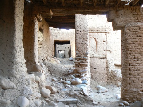 M'Barek macht mit mir noch einen Rundgang durch den Ksar, das angrenzende befestigte Dorf. Durch einen unscheinbaren Eingang kommt man in eine schmale Gasse, biegt um eine Ecke und muss noch ein zweites schweres Holztor passieren. Diese Wehrdörfer haben immer einen solch komplizierten Eingang, um Fremden ein Eindringen zu erschweren. Über den schmalen Straßen gibt es regelmäßig Beobachtungstürme, von deren Fenstern man in alle Richtungen sehen kann. Oft glaubt man vor einer Haustür zu stehen, aber es ist nur ein Eingang für eine andere Straße. So kann man einzelne Stadtteile verschließen und ein Zurechtfinden ist für Fremde unmöglich.