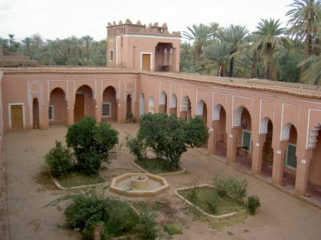 So sind die Zimmer auch wunderschön dekoriert. Um einen arkadengesäumten Innenhof mit Garten und Springbrunnen sind die verschiedenen Räume gruppiert. Leider haben die Witterungseinflüsse einen großen Teil der Lehmburg schon beschädigt, aber einiges ist noch gut erhalten. Das "Chambre d'Eté" wird wegen seiner zwei hohen Flügeltüren so genannt, es ist auch im heißen Sommer von Agdz angenehm kühl. Die Deckengewölbe sind wie ein Sultanszelt bemalt. Eine der bunt bemalten Holztüren führt zum Innenhof, die andere gibt den Weg in den Palmengarten frei. In den großen Türen ist immer noch eine kleine Tür eingebaut. Der Grund liegt in dem großen Riegel, der höllischen Krach macht. Wenn der Muezzin bei Sonnenaufgang zum ersten Gebet ruft, kann man leicht die kleine Tür öffnen ohne die gesamte Familie zu wecken. Als M'Barek andeutet, dass man diese Zimmer auch mieten kann, entscheide ich mich sofort, hier zu wohnen. Wann hat man schon einmal Gelegenheit, in einer solchen Kasbah zu schlafen. Da kommt mein Zelt nicht mit.