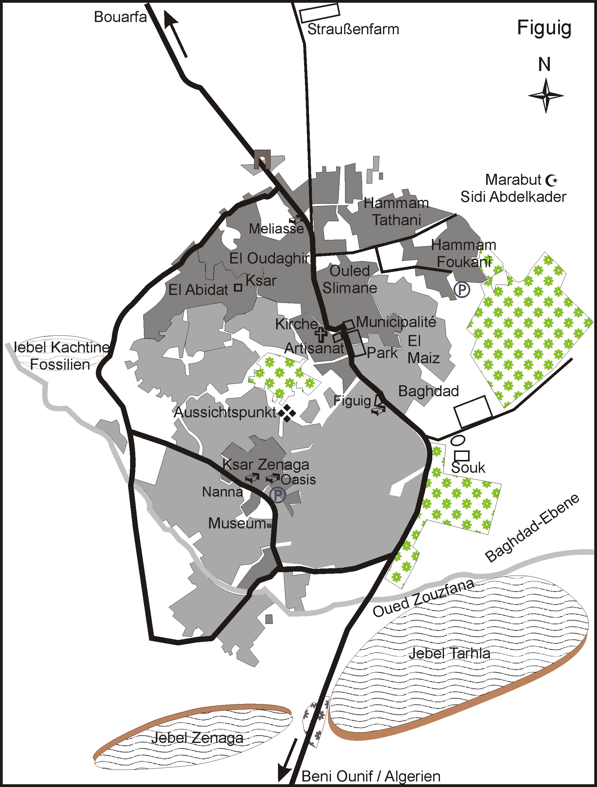 Die schöne Oasengruppe liegt auf 900 m an den Ausläufern des Jebel Grouz. Sie bedeckt eine rund 20 Quadratkilometer große, von Berggipfeln umgebene Mulde und wird von heute sieben ummauerten Ksour bewirtschaftet: Zenaga im Süden, der größte und bedeutendste Ksar, El Oudaghir, El Abidat, El Maiz, Ouled Slimane, Hammam Foukani und Hammam Tathani. Es gibt noch weitere Ksour, die teils auf algerischem Gebiet liegen, dazu gehört vor allem Beni Ounif. Im Jahr 1845 sprach der französische General Daumas von zwölf Ksour um Figuig.
